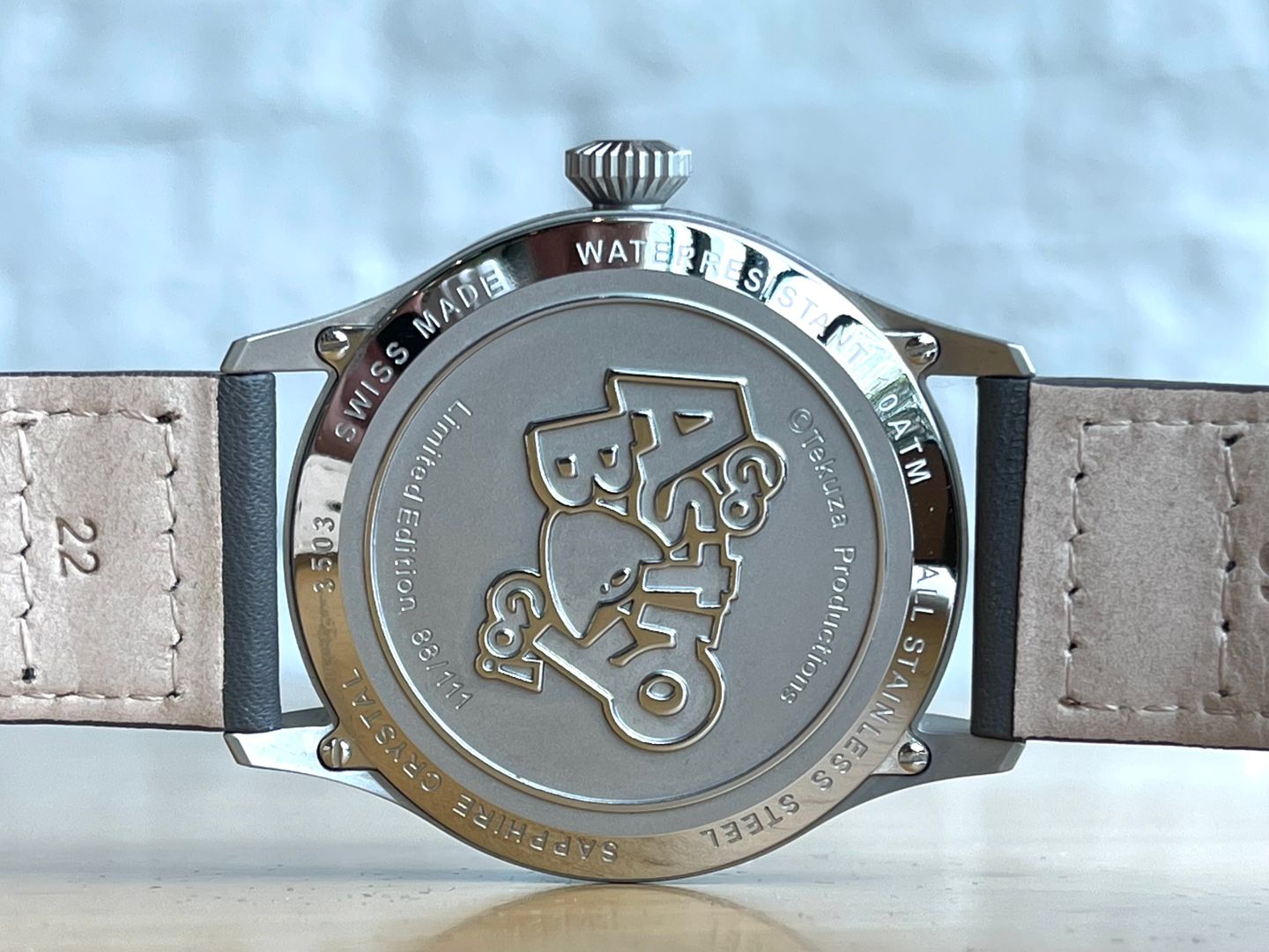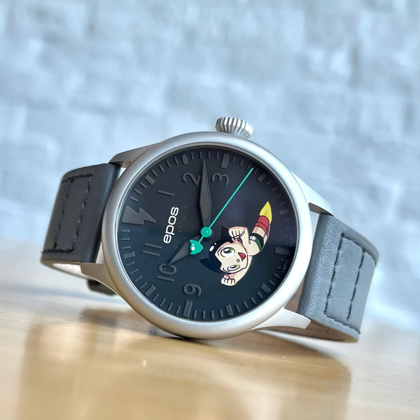 นาฬิกา EPOS มาใน OFFICIAL COLLABORATION กับ CLASSIC JAPANESE CARTOON CHARACTER อย่างเจ้าหนูอะตอมหรือ ASTRO BOY ตัวเรือน STYLE CLASSIC PILOT WATCH ขนาด 42MM FINISHING แบบ SANDBLASTED พร้อมที่จะเป็น BEATER เรือนโปรดในทุกกิจกรรม เม็ดมะยม STYLE CLASSIC ทรง FLUTED MODERN ONION หน้าปัดเป็นสี MATTE BLACK ไม่รบกวนสายตา MARKERS และเข็มเป็นสีดำทั้งหมดเข้ากับ LUME สีเทาเข้ม โดดเด่นด้วย GREEN SECOND HAND ที่มีสัญลักษณ์ ASTRO BOY อยู่ปลายเข็มและ ASTRO BOY บินเด่นอยู่กลางหน้าปัด ฝาหลังแกะลายสัญลักษณ์ ASTRO BOY พร้อมเลขประจำตัวเรือนสุดพิเศษ 88/111 สายติดตัวเรือนมาพร้อมสายสีเทานวลไปกับตัวเรือน นาฬิกามาเป็น BENTO SET ของแถมในกล่องแน่น ๆ มีสายสีดำเดินด้ายสีเขียวมาให้ ใบ CERTIFICATE รวมถึงหมวก ASTRO BOY สวย ๆ ใหม่กริ๊บอีก 1 ใบ