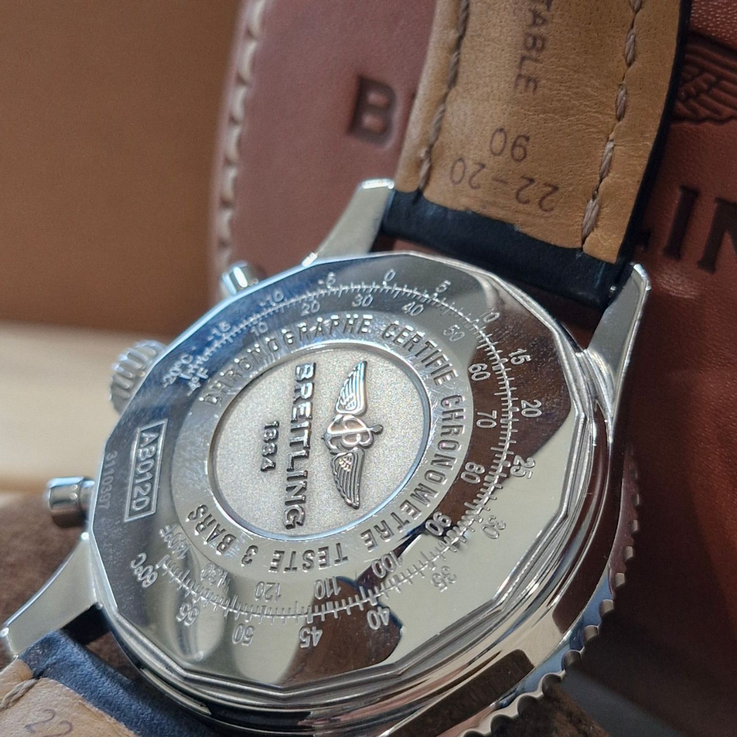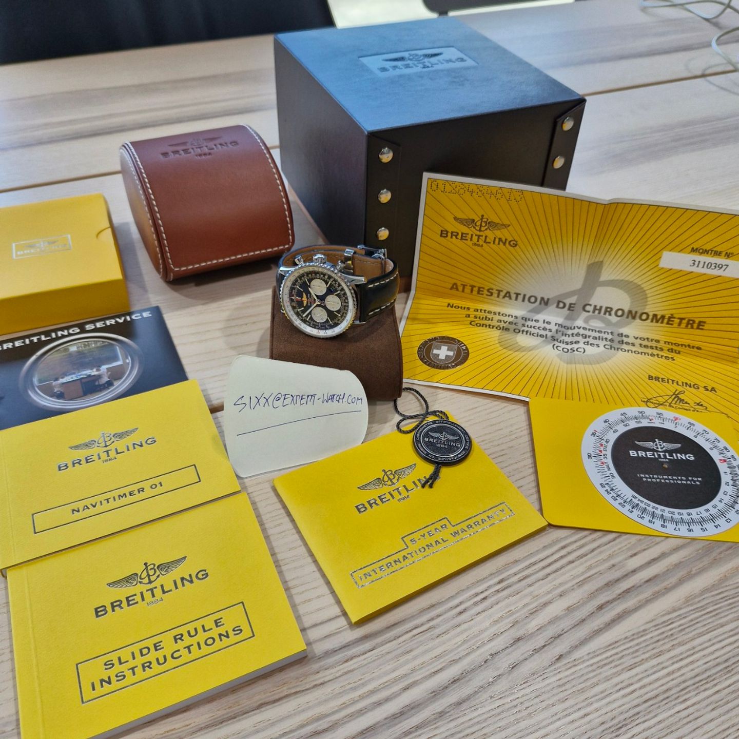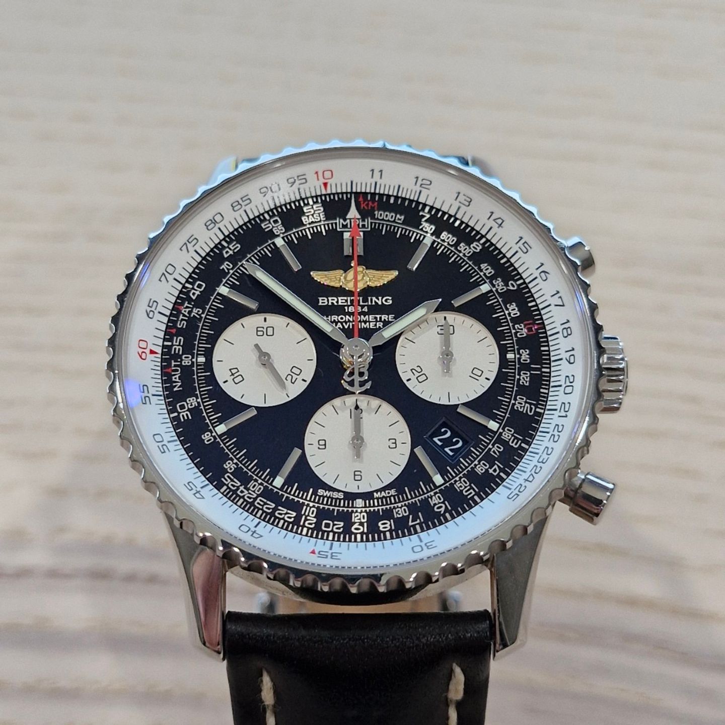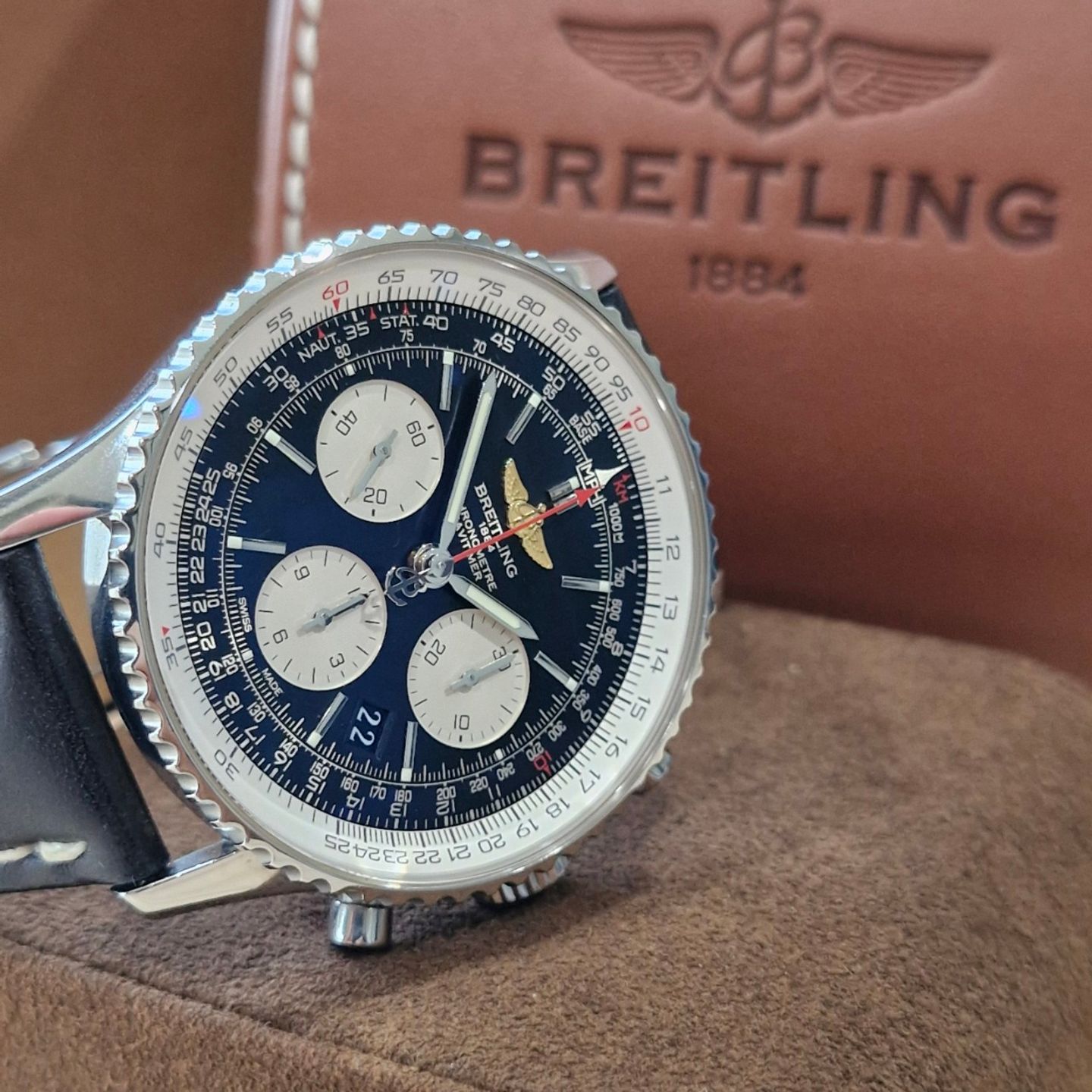 BREITLING Navitimer B01 43mm โมเดล AB0120 นาฬิกานักบิน ICONIC เอกลักษณ์ที่สุด โลโก้ปีก Emblem ตัวสุดท้าย มาพร้อมสายหนังวัว Breitling เบิกใหม่สภาพกริ๊บๆ บัคเคิลบานพับ กลไก Inhouse B01 เดินดี รีเซ็ตตรง กระจกไร้รอย AR Coating ใสปิ๊ง ตัวเรือนริ้วรอยเล็กน้อยตามการใช้งาน อุปกรณ์ครบยกกล่อง