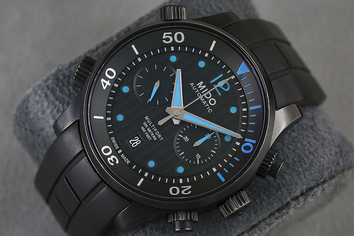 Mido Multifort Chronograph ขนาด King Size 44mm. (วัดไม่รวมเม็ดมะยม) ตัวเรือน PVD สีดำ แข็งแรงทนทานไม่ลอกร่อน ระบบ Automatic Chronograph ตัวเครื่องสมบูรณ์ทุกระบบ แสดงวันที่ ที่ตำแหน่ง 6 นาฬิกา (วันที่แบบ Quick Set สามารถกดเปลี่ยนแบบรวดเร็วจากเม็ดมะยมตำแหน่ง 10 นาฬิกา) หน้าปัดดำ ลายกิโยเช่ มีมิติสวยงาม ขอบหน้าปัดด้านในสามารถหมุนเทียบจับเวลาได้ (หมุนได้จากเม็ดมะยม ตำแหน่ง 8 นาฬิกา) กระจก Sapphire Crystal กันรอย สายยางคุณภาพสูง ทนทานสุดๆ สภาพสวยมาก โดยรวม 95%+ มาตัวเปล่า ข้อสายยาวถึงข้อมือ 6.9 นิ้ว จัดให้ราคาถูกสุดเพียง 19,500 เท่านั้นครับ
