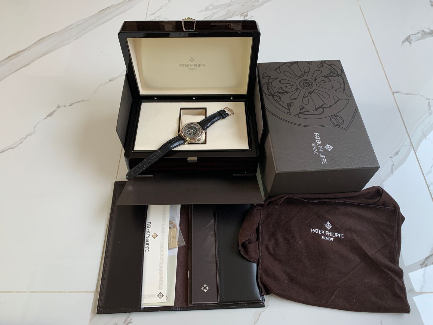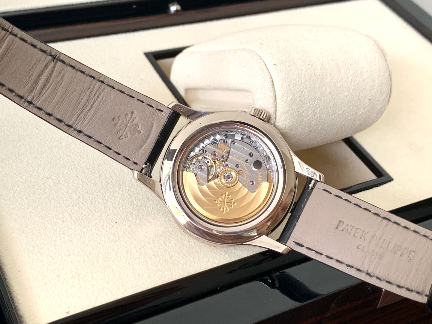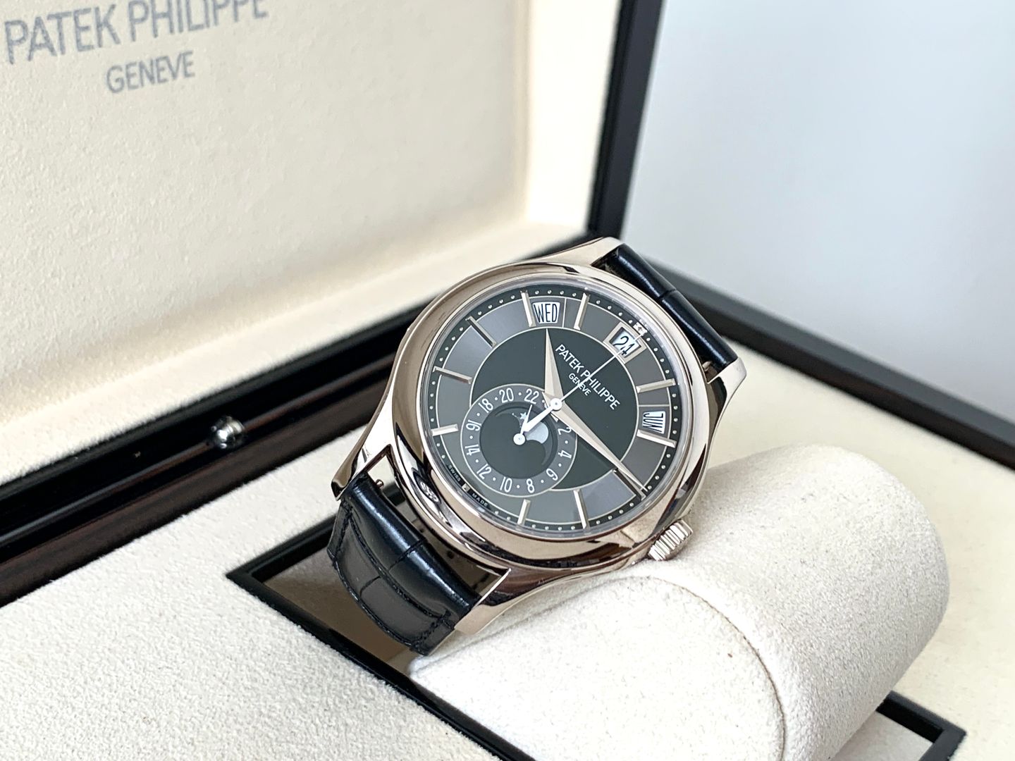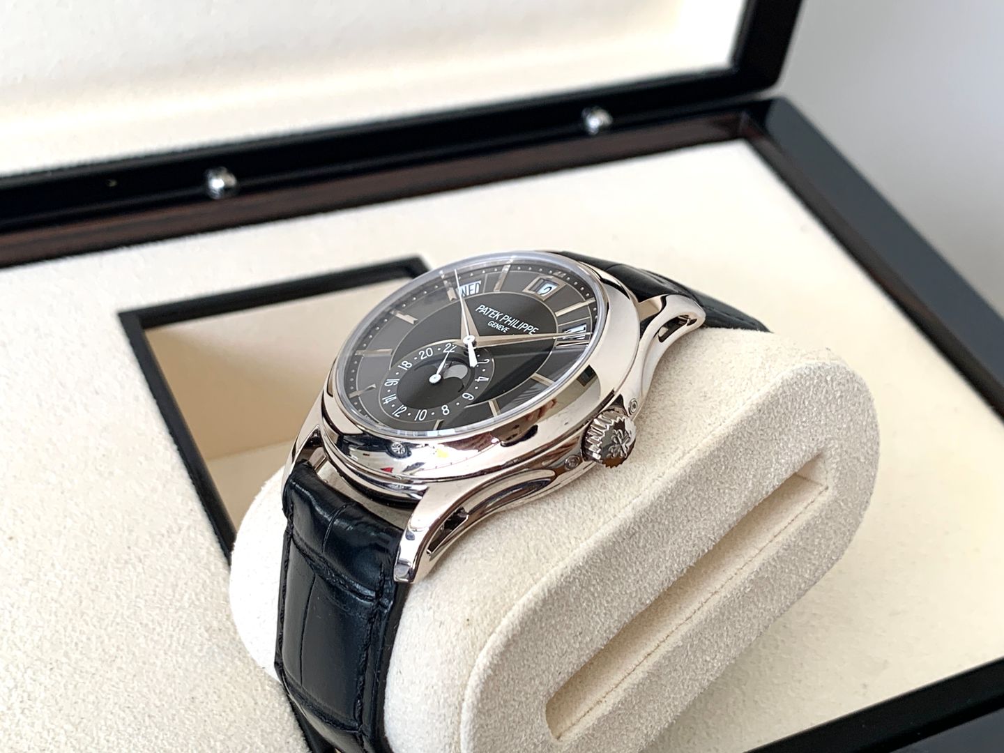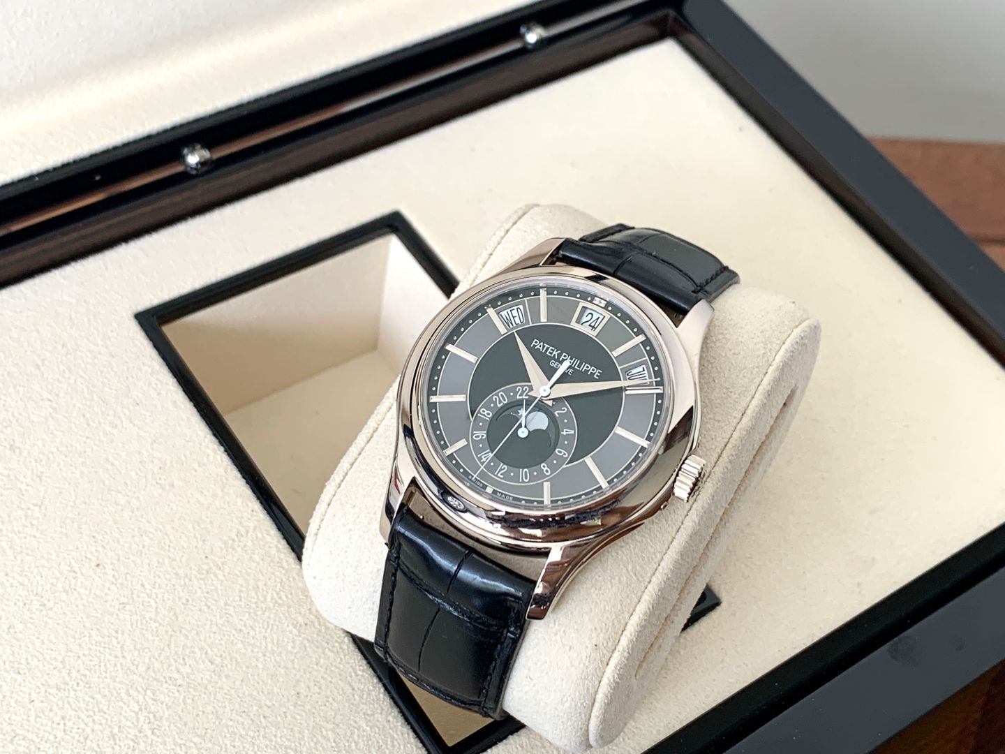 Patek Philippe Complications 5205G Annual Calendar White Gold Black Dial REF. 5205G-010 ด้วยความขึ้นชื่อในโทนสีเทาดำที่สวยที่สุดของ PP ผสานเข้ากับฟังก์ชันคลาสสิกชื่อดังของแบรนด์อย่าง Annual Calendar ทำให้นาฬิกาในคอลเลคชัน Complications รุ่น 5205G เป็นความหรูหราของการบอกเวลาและปฏิทินที่หาตัวจับได้ยาก ด้วยการตกแต่งอย่างมีชั้นเชิงของการเล่นเฉดสี การจัดวางหน้าต่างแสดงค่าปฏิทินอย่างสบายตา และ Moon Phase ที่น่าหลงใหล ตัดด้วยหลักเวลาเงางามจาก Ruthenium โลหะตระกูลแพลตตินัม ช่วยเติมออร่าสว่างตาให้กับนาฬิกาปัดที่ดูคล้ายยามค่ำคืน ให้มีเสน่ห์จับตายิ่งขึ้น เป็นอีกหนึ่งรุ่นยอดนิยมในบ้านเรา จะใส่หรือเก็บสะสมก็เหมาะ กับสภาพสวยหมดจด ผิวปัดเงาสะอาดใส สายหนังสภาพดีใช้ได้ยาวๆ ครับ ตัวเรือน White Gold ขนาด 40 มม. บอกเวลาแบบสามเข็ม, แสดงวันในสัปดาห์ วันที่และเดือนด้วยระบบ Annual Calendar, บอกเวลา 24 ชั่วโมงร่วมกับ Moon Phase ใช้กลไกออโตเมติก 48 ชั่วโมง Cal. 324 S QA LU 24H/206 กันน้ำลึก 30 เมตร