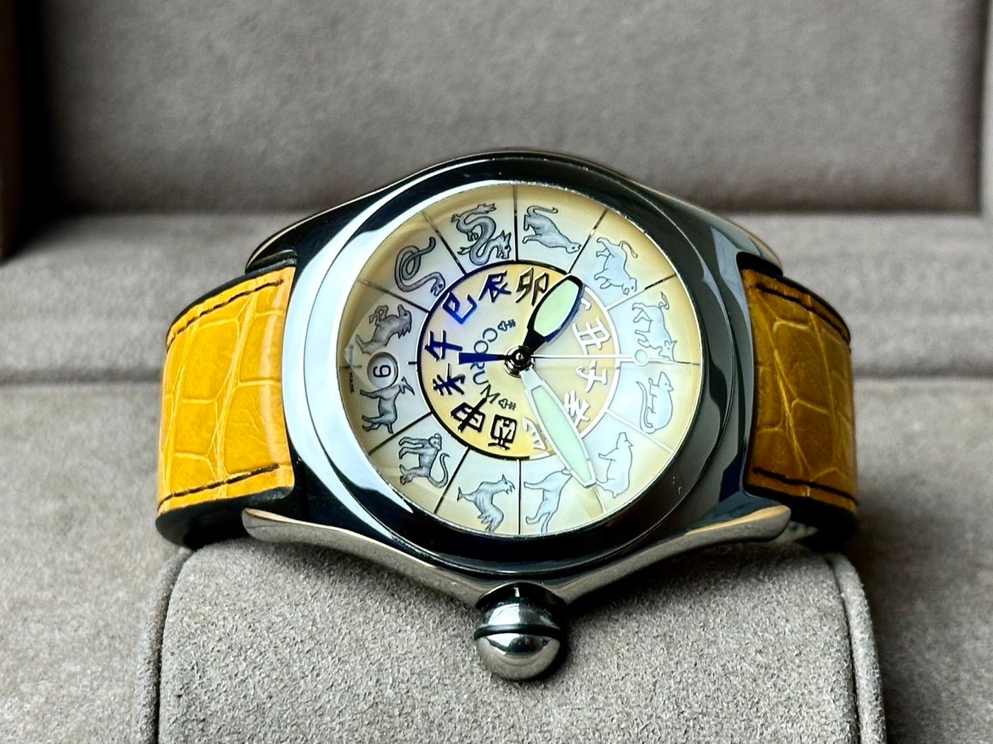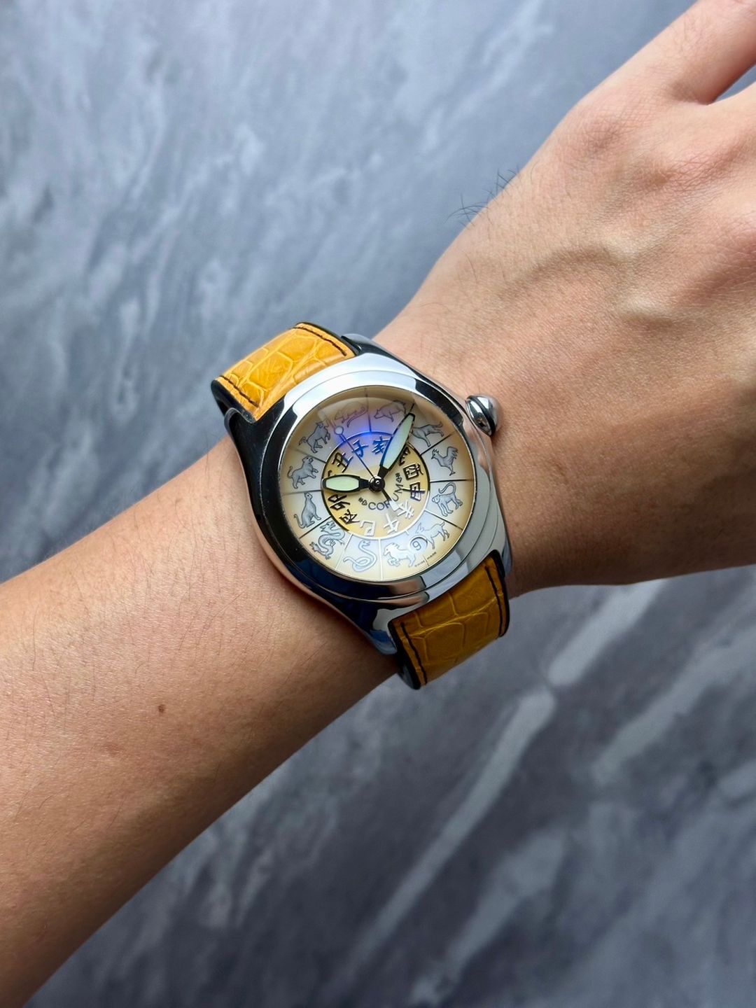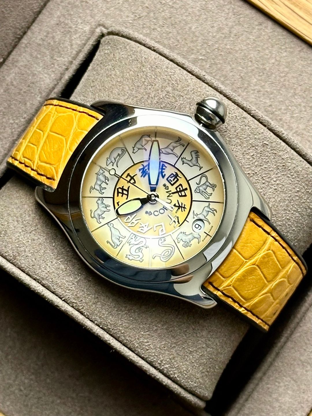 Corum Bubble Zodiac Limited Edition Movement Automatic ขนาดตัวเรือน 45mm สำรองพลังงาน 42ชั่วโมง กันน้ำระดับ 20ATM Zodiac Dial หน้าปัดแสดงนักษัตรจักรราศี พร้อมช่องแสดงวันที่ตำแหน่ง 6 นาฬิกา ฝาหลังเปลือยโชว์ตัวเครื่อง กระจก Sapphire ทรงโดม เอกลักษณ์ของรุ่น Bubble อุปกรณ์ FullSet กล่องนอก-ใน เล่มคู่มือ ใบรับประกัน Open ตัวเรือนสภาพสวยสมบูรณ์ทุกประการ ใส่เต็มข้อแมนๆ สายหนังบานพับปีกผีเสื้อสะดวกต่อการใช้งาน นาฬิกาสไตล์สายมู ไม่ซ้ำใครง่ายๆแน่นอนครับ