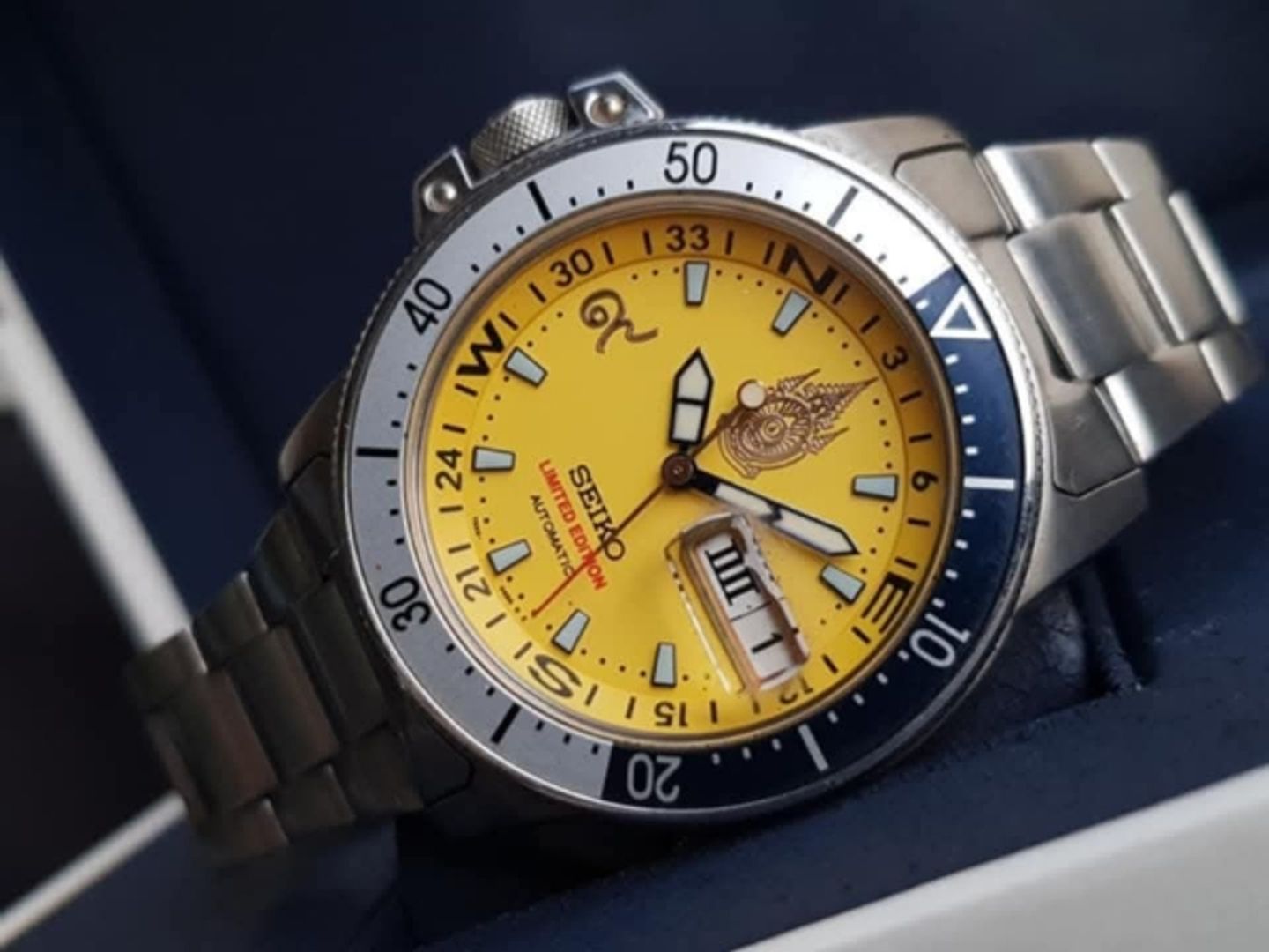 นาฬิกาเป็นระบบ Automatic มีการอัญเชิญตราสัญลักษณ์ของวโรกาสพิเศษนี้ ไว้บนหน้าปัดที่ตำแหน่ง 12 นาฬิกา ขอบ bezel หมุนได้ หน้าปัดสีเหลือง เพิ่มดีไซน์เลขหลักบนหน้าปัดพิเศษที่ตำแหน่ง 9 น. เป็นเลขเก้าไทย (๙) สีทองสวยงาม ซึ่งหมายถึงรัชกาลที่ ๙ กระจก Sapphire Crystal กันรอย มีหน้าต่างแสดงวันที่ และวันในสัปดาห์ที่ตำแหน่ง 3 น. มะยมขันเกลียว สลักเลข ๙ สวยงาม อุปกรณ์ครบ มาพร้อมกล่องใบและสายหนังสำรอง ควรค่าแก่การสะสมมากๆครับ
