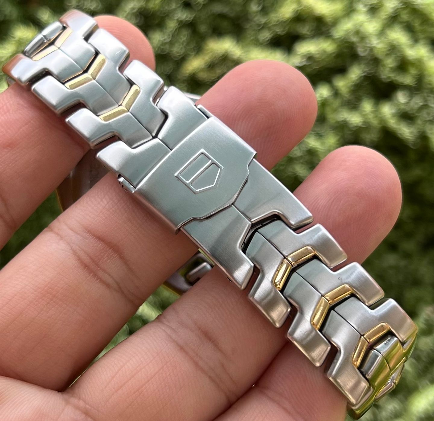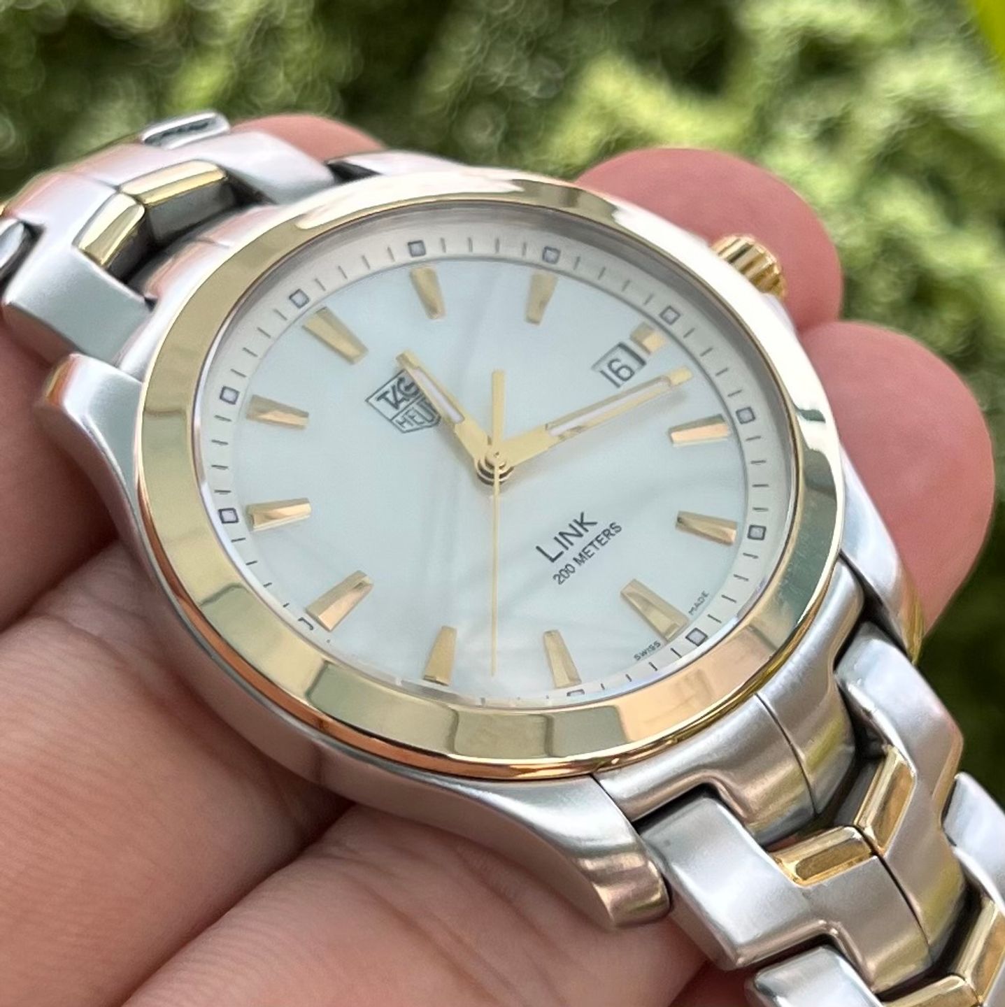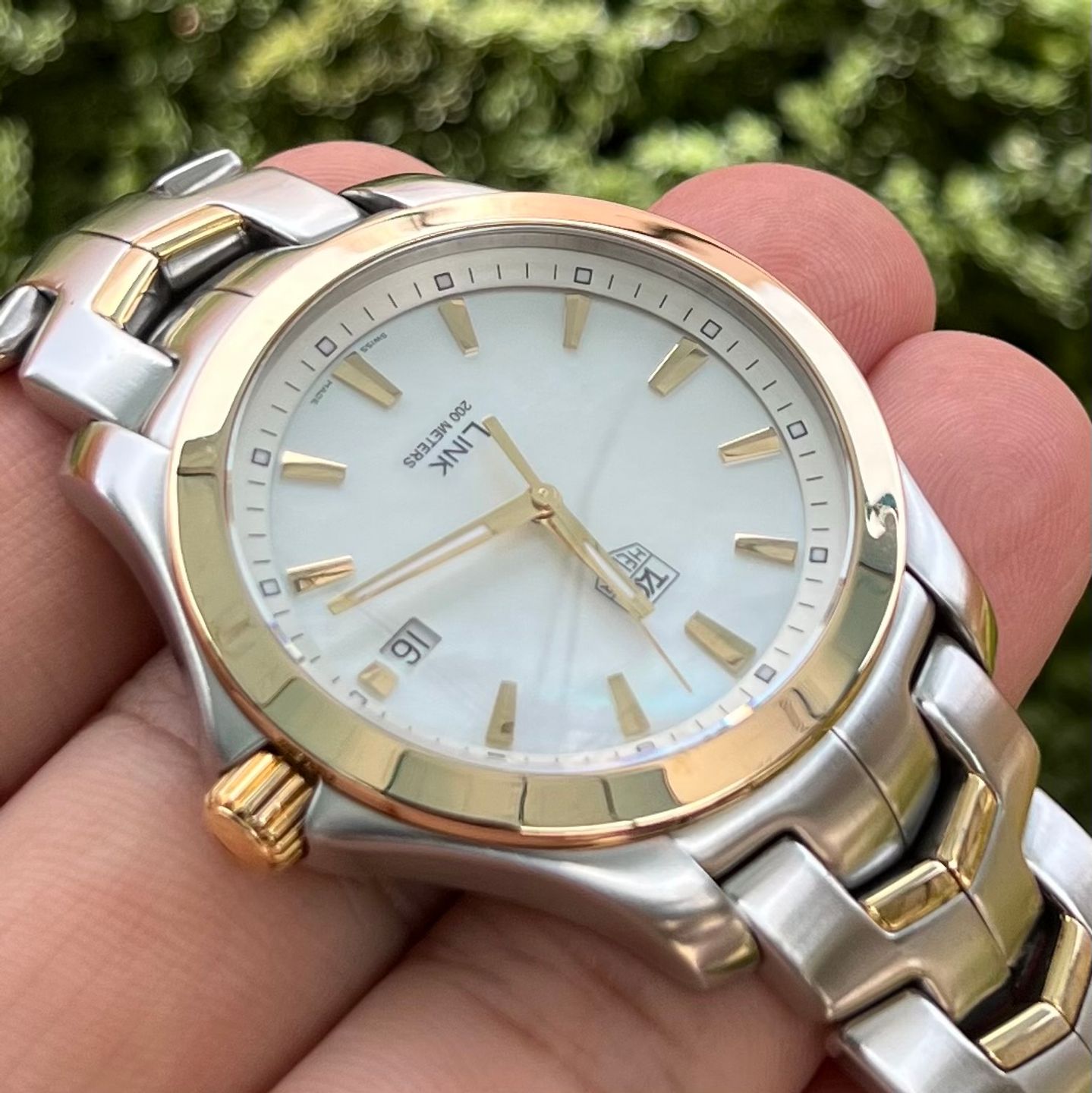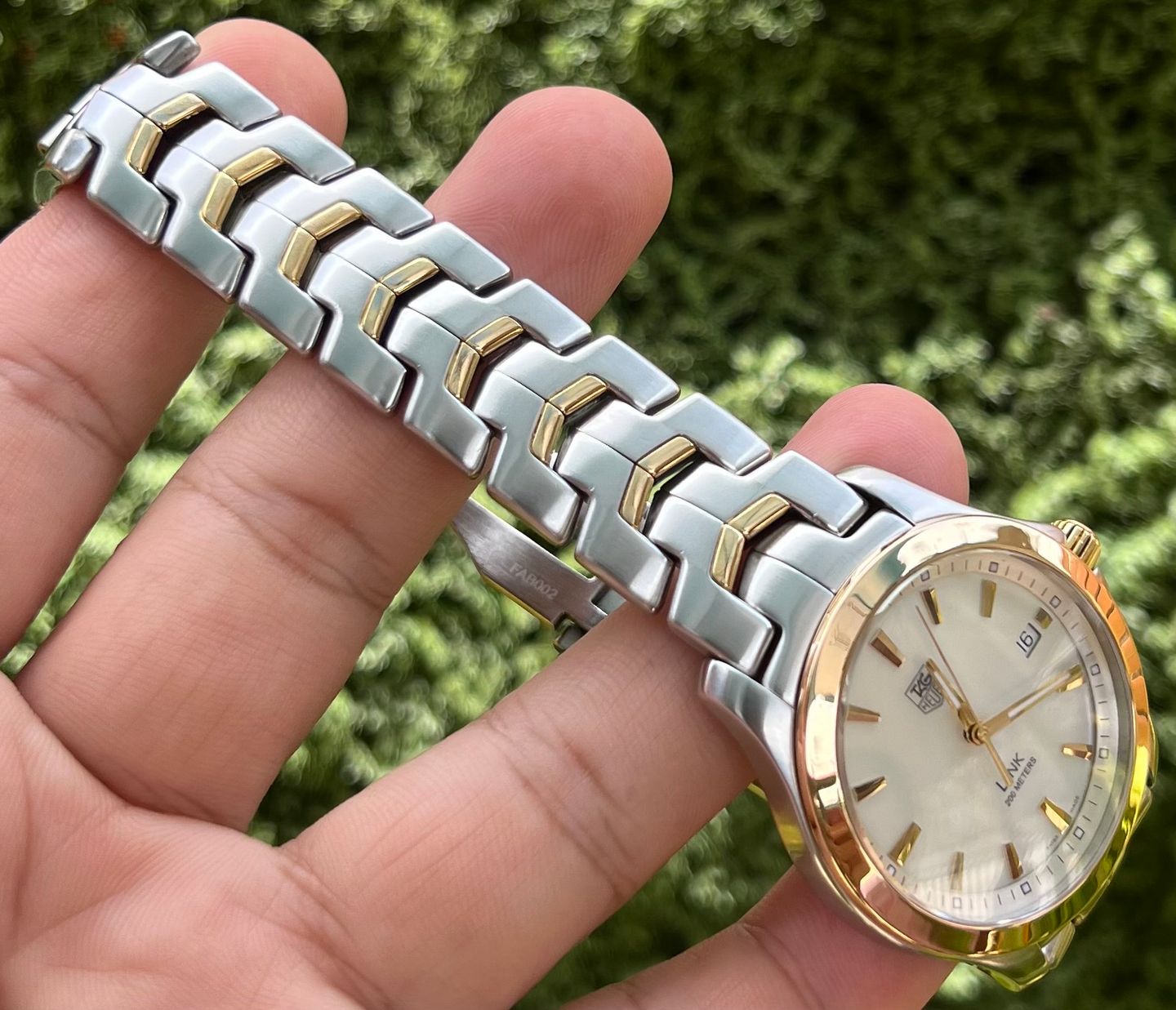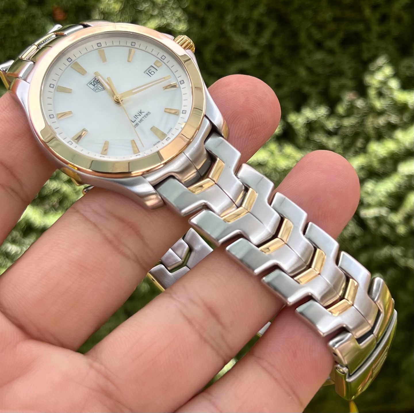 TAG Heuer Link 18K WJF1152 ** เครื่องระบบ Quartz ** หน้าปัดสีขาวมุก King Size ขนาดหน้าปัด 39 มิล ** ตัวเรือนด้าน ขอบเบเซอร์ทอง 18K สายด้านขริบทอง ** กระจก Crystal Sapphire กันรอยขีดข่วน ** แสดงวัน วันที่ ตำแหน่ง 3 นาฬิกา ** สภาพสวย ของแท้100% ** รับประกันตัวเครื่อง 1 ปี ** อปก.กล่องแทน